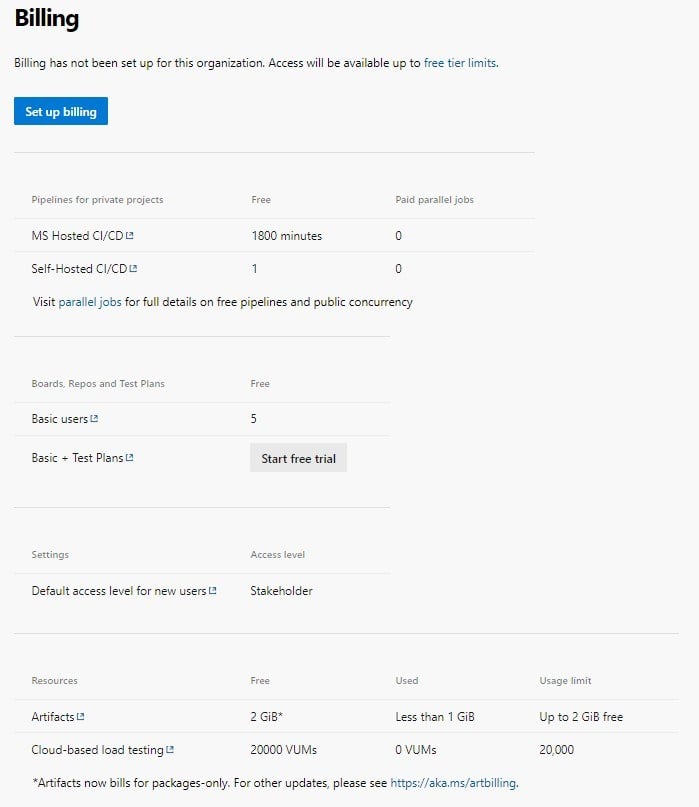 Toto nastavení slouží k tomu, abyste si v organizaci nastavili, kam se budou účtovat využité služby. Defaultně organizace není nastavena na účtování, proto podléhá limitům verze zdarma, která vás omezuje na 5 uživatelů s basic plánem na organizaci, na jednu pipeline za privátní projekt, na 1800 minut MS Hosted CI/CD, a další důležitá omezení. Avšak můžete používat všechny služby (až na test plans), jsou však omezené. Pokud chcete nastavit účtování, tak klikněte na tlačítko "Set up billing", které vám otevře nové okno vpravo. Poté si vyberte pod jaké Azure předplatné chcete Azure DevOps zařadit a klikněte na Save vpravo dole.