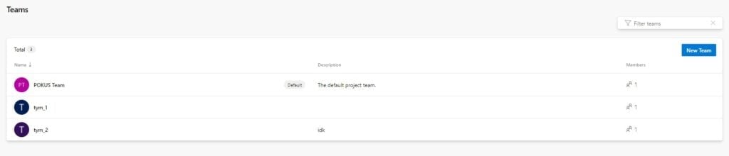 V kolonce Teams vidíme všechny naše týmy. Pokud si na některý z těchto týmů klikneme, tak se dostaneme do nastavení daného týmu, kde můžeme tým měnit, odstraňovat, přidávat do něj uživatele a mnohem více. Tlačítkem "New Team", které je vpravo nahoře, přidáme tým nový.