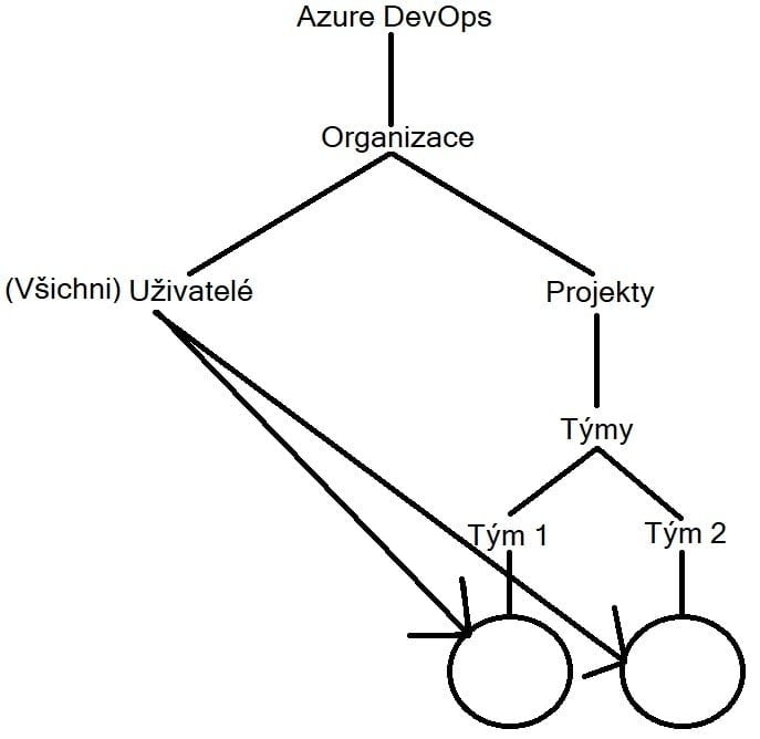 Azure DevOps funguje na základě uživatele. Tento uživatel je poté řazen do různých organizací. Tyto organizace obsahují projekty. Je důležité si uvědomit, že jeden uživatel může být ve více organizacích. Je proto možné mít více organizací pro různé vývojové týmy, avšak to pouze v případě, že je to pro vás lepší, než mít vše pod jednou organizací. V organizaci také jsou, jak už jsme si říkaly, projekty, které jsou buď veřejné, nebo soukromé. Veřejné projekty může vidět každý, kdo je v organizaci, zatím co soukromé může vidět pouze ten, kdo je v daných projektech přidaný.