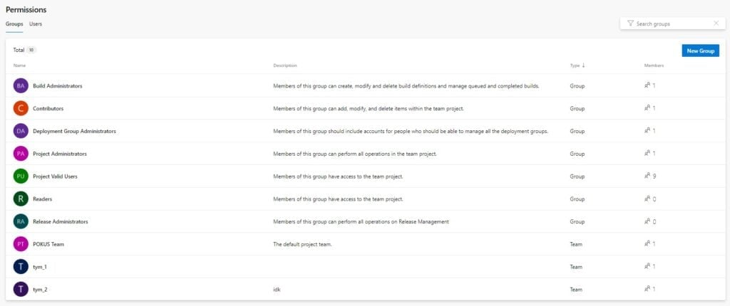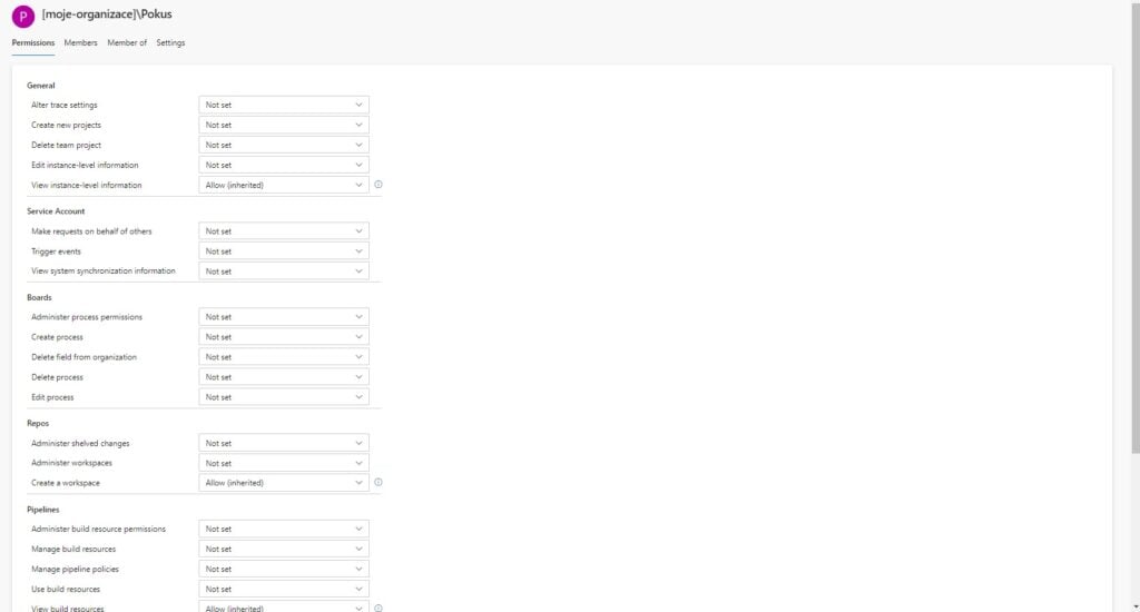 Jak si můžete povšimnout, tak pod jedním Azure DevOps může být více organizací a každá má pod sebou všechny uživatele dané organizace a projekty dané organizace. Tito uživatelé však (pokud neurčeno jinak) mají pouze práva na prohlížení projektů, které jsou jim příslušní, nebo jsou veřejné. Dále jsou pod každým projektem týmy. Týmům jsou přiřazovaná práva a uživatelé. Tito uživatelé poté podléhají právům týmu u daného projektu. Když už jsme pochopili, jak práva fungují, tak je můžeme přiřadit našim existujícím týmům.