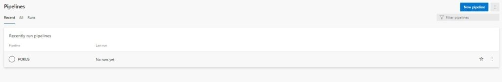Tato část Pipelines je jedna z nejdůležitějších, protože zde propojíte pipeline na build a přidáte k ní publikování. To uděláte tak, že kliknete na tlačítko "New pipeline"