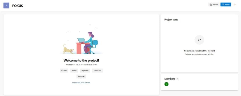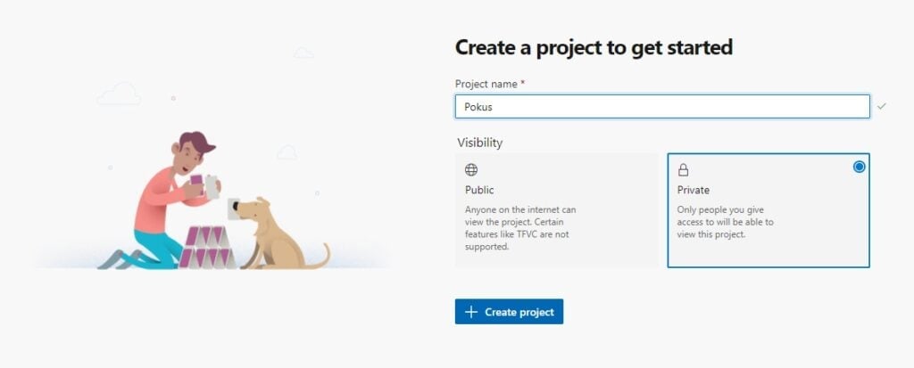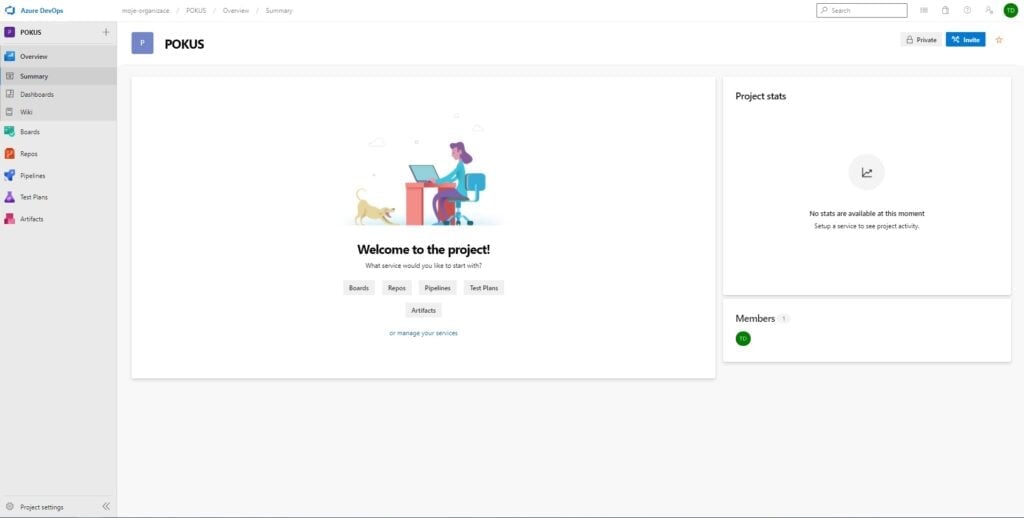 Pokud jste si nainstalovali Azure DevOps server, tak vás lokální webový portál už navede bez větších problémů. Organizace se vám automaticky vytvořila, musíte pouze vytvořit první projekt.