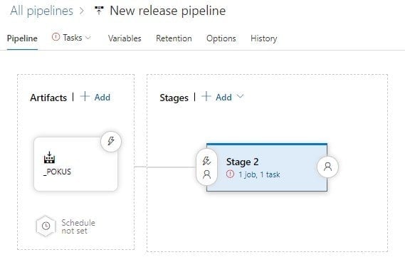 Vlevo si nastavíte stavěcí pipeline a vpravo si po kliknutí vyberete, jaký styl publikování preferujete, avšak si všimněte toho, že u horní kolonky "Tasks" je vykřičník a pipeline nejde uložit. Abychom totiž mohli publikovat náš hotový build, musíme nastavit informace o tom, kam to publikujeme. Jakmile si kliknete na Tasks, tak se dostanete do následujícího prostředí:
