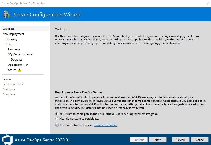 - Až se vám soubor stáhne, tak už ho stačí jenom otevřít. Poté co ho otevřete, tak si vyberete umístění, kam chcete Azure DevOps nainstalovat a kliknete na tlačítko "Další". Jakmile se dokončí přípravy před instalací, tak byste se měli dostat do následujícího menu: