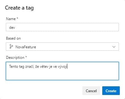 V tomto okně zadejte jméno tagu, větev, na kterou bude přidán, a nějaký popis tagu. Poté jsme schopni se přes náš vytvořený tag dostat k větvi.