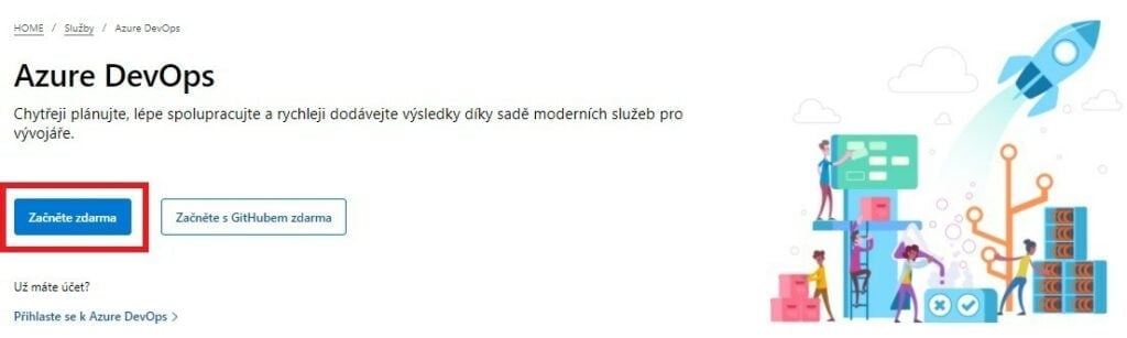 Pokud jste se rozhodli použít Azure DevOps v cloudu, tak se přesuňte na stránky Azure DevOps, kde klikněte na tlačítko "Začněte zdarma".