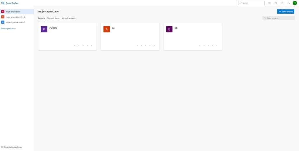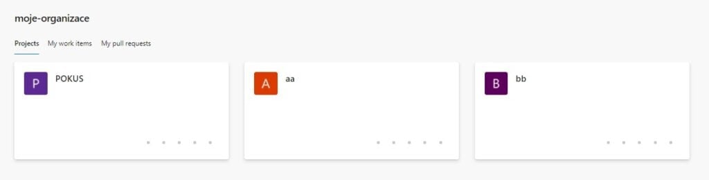 Zde si můžeme všimnout jména naší organizace, pod jménem překlikávacího menu, kde si můžeme vybrat: "Projects", "My work items", "My pull requests". V kolonce "Projects" vidíme všechny projekty, které jsou buď veřejné, nebo jsme jejich součástí, seřazené dle toho, jak je navštěvujete. Na tyto projekty si můžeme kliknout a dostaneme se do menu projektu.