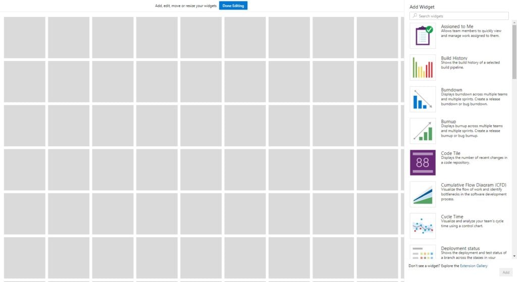 Stránka Dashboards je místo, kde si každý team/jednotlivec může uspořádat co vše chcete vidět na jednom místě. To uděláte tak, že si kliknete na tlačítko "Add widget", nebo "Edit". V tuto chvíli se přesunete do editovacího režimu.