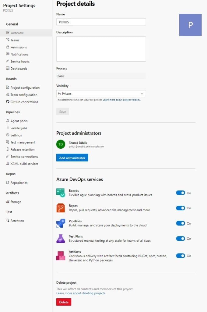 Jak si můžete všimnout, vlevo mám zapnuté všechny defaultní služby a pokud se rozhodnete založit projekt a začít pracovat s Azure DevOps, tak budete s největší pravděpodobností každou defaultní službu využívat, tak si o každé z nich musíme říct alespoň základy.