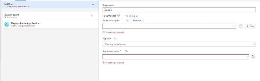 Zde si musíte propojit Azure subsription a service name, abyste mohli pokračovat a stisknout tlačítko "Save". V tuto chvíli máte pipeline hotovou a můžete ji spustit.