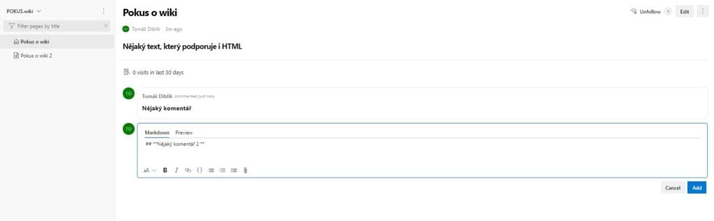 Na tomto rozcestí vlevo vidíte všechny vaše stránky wiki. Vpravo vidíte obsah stránky a pod obsahem můžete psát komentáře. Stránka jde také editovat tlačítkem vpravo nahoře "edit".