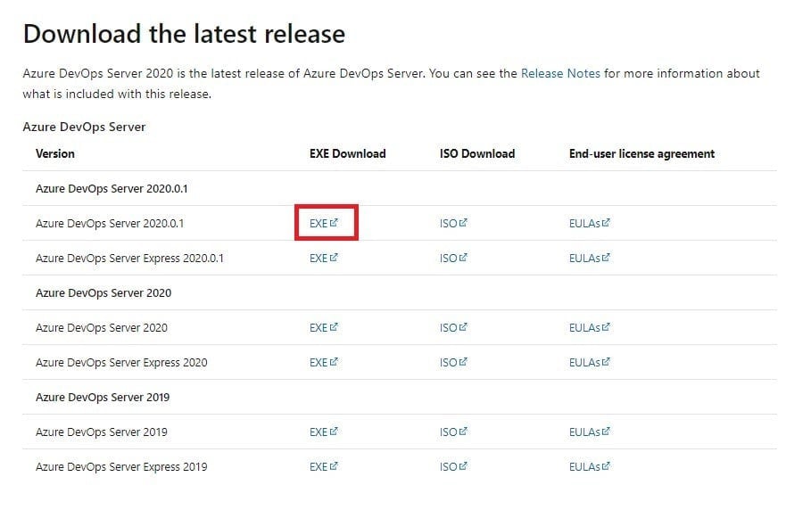 - Předchozí akce vás následně přesměrovala na stránku, kde si můžete stáhnout dostupné verze Azure DevOps serveru v .exe, nebo .iso formátu. Rozdíl mezi normální verzí a verzí express je ten, že express není placený vůbec, avšak podléhá limitům, které jsou též zdarma v Azure DevOps (cloud). Přepokládejme, že si chcete stáhnout .exe v nejnovější plné zkušební verzi na 90 dní.
