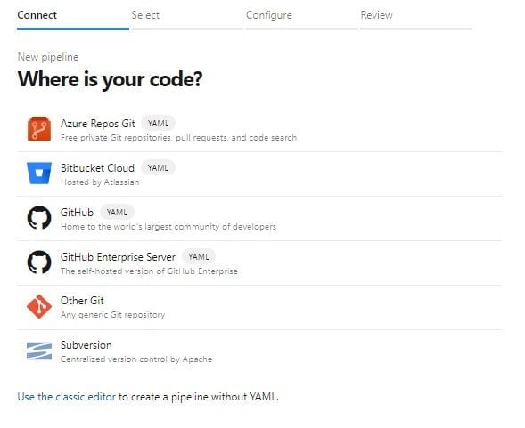 Na této obrazovce si vyberete, kde máte uložený kód. Pokud se vám nechce pipeline psát v YAML, klikněte na dolní možnost "Use the classic editor", avšak v tomto článku toto nebudeme dělat. Jakmile si kliknete na jednu z možností, musíte připojit repositář, pro který bude pipeline dělána. Jakmile jste udělali všechny kroky, tak se vám objeví okno, kde můžete psát váš YAML. Jakmile jste dopsali kód, klikněte na šipečku vedle tlačítka "Run", která je vpravo nahoře, a poté klikněte na možnost "Save". Jakmile jste dokončili všechny kroky, tak by vaše okno mělo vypadat následovně: