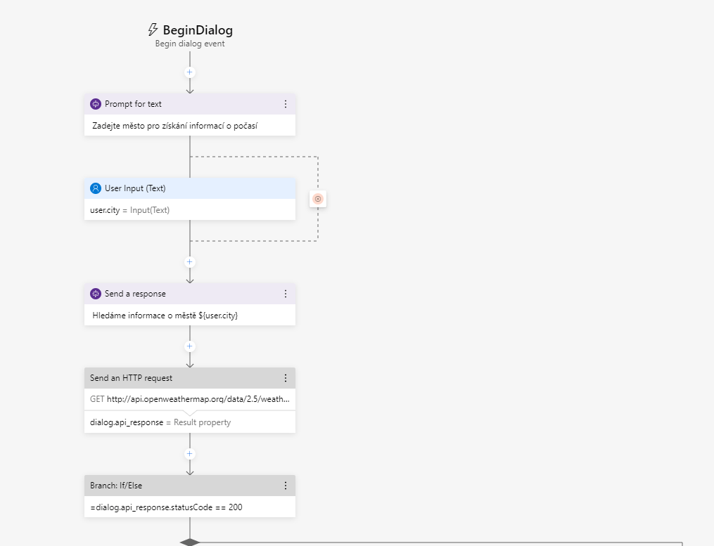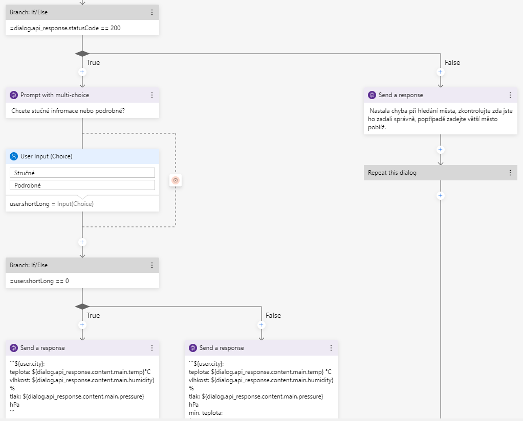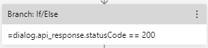 Do této podmínky napíšeme "=dialog.api_response.statusCode == 200". Rovnítka se zde nachází, protože nejdříve se pomocí tohoto textu ujistíme, zda true nebo false. Poté tento výsledek vrátíme celé podmínce. Můžete si to představit, jako kdyby celý text svírala závorka > nejdříve se vše vypočítá a pak se porovná výsledek.