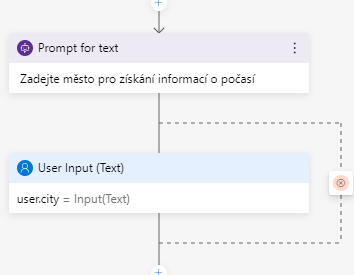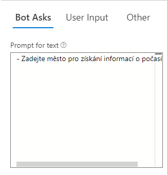 Do Prompt for text vyplníme například „- Zadejte město pro získání informací o počasí“ (pomlčky v těchto případech určují možnosti, pokud by jste vyplnili více textů s pomlčkami na začátku, tak bot pokaždé náhodně vybere jednu z možností)