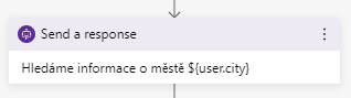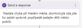 Uživateli pošleme odpověď pomocí Send a Response. Můžeme mu napsat například "- Nastala chyba při hledání města, zkontrolujte, zda jste ho zadali správně, popřípadě zadejte větší město poblíž.".