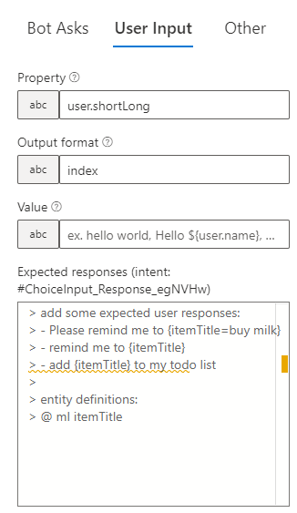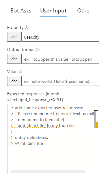V User Input nastavíme Property na „user.city“. Díky tomu se nám vyplněná informace uloží do objektu user pod názvem city.