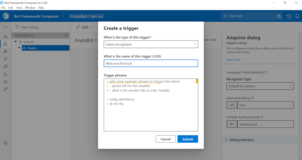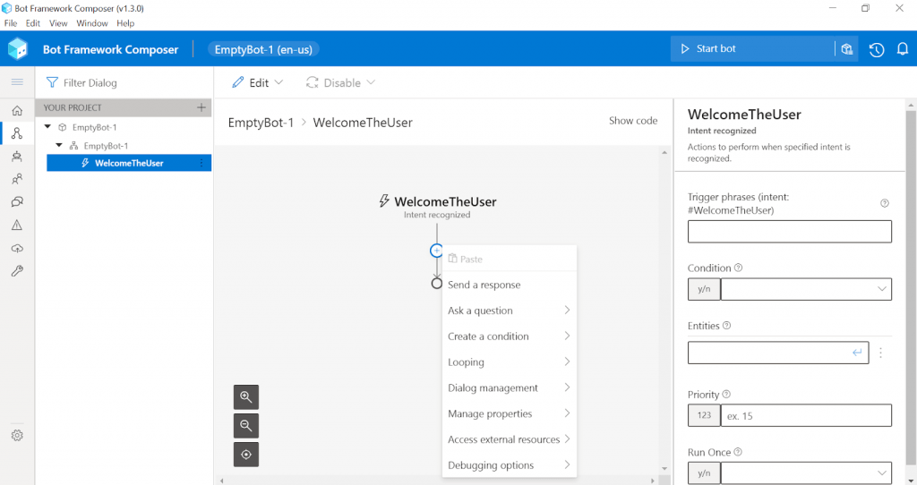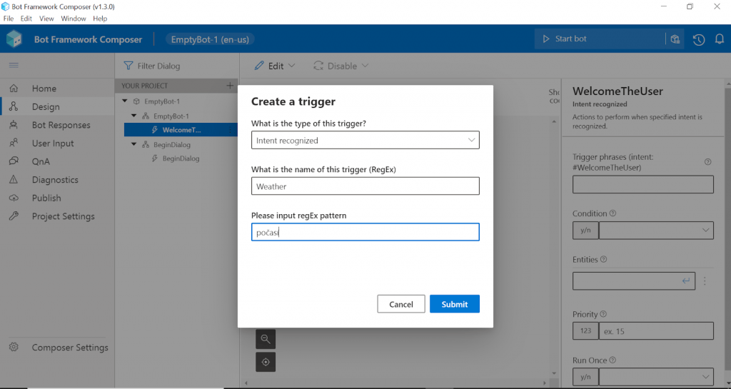 Všimněme si, že nám Composer defaultně nastavil tzv. “Trigger”, neboli relace, která vyzve vašeho robota k akci. Tento “Conversation started trigger” si můžeme libovolně pojmenovat, například “WelcomeTheUser.”