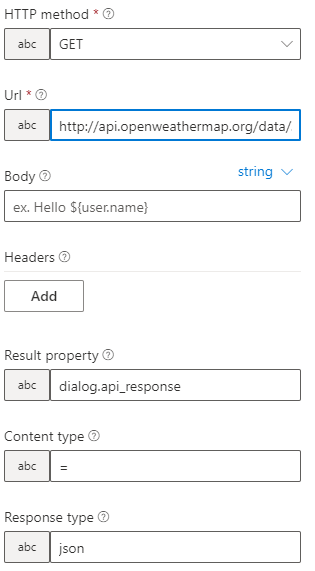 Vybereme metodu GET (to znamená, že atributy/hodnota píšeme přímo do našeho od "odkazu" požadavku). Do Url vložte "http://api.openweathermap.org/data/2.5/weather?q=${user.city},CZ&appid=VašeAPI&units=metric" (pokud máte zájem o více informacích o API požadavcích, tak zavítejte na Current weather data - Dokumentace). A do Result property napíšeme "dialog.api_response" (do objektu dialog do proměné api_response se nám uloží naše proměnná). Do Content type vložíme "=", tím určíme, že se nám vrácená hodnota uloží do naší proměné a u Response type vybereme "json", protože to je typ dat, které nám API vrátí.