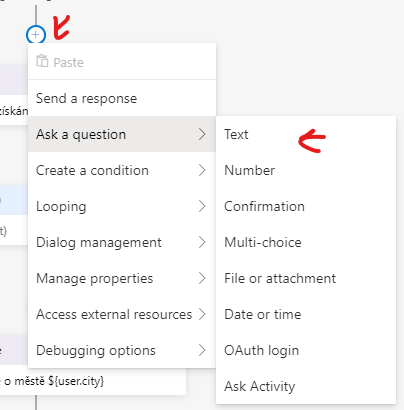 Nejdříve se uživatele zeptáme na název města pomocí Ask a question – Text (klikneme na tlačítko se symbolem + a vybereme Text).