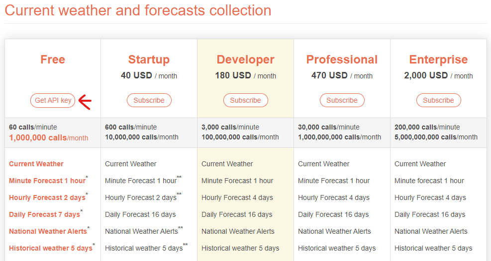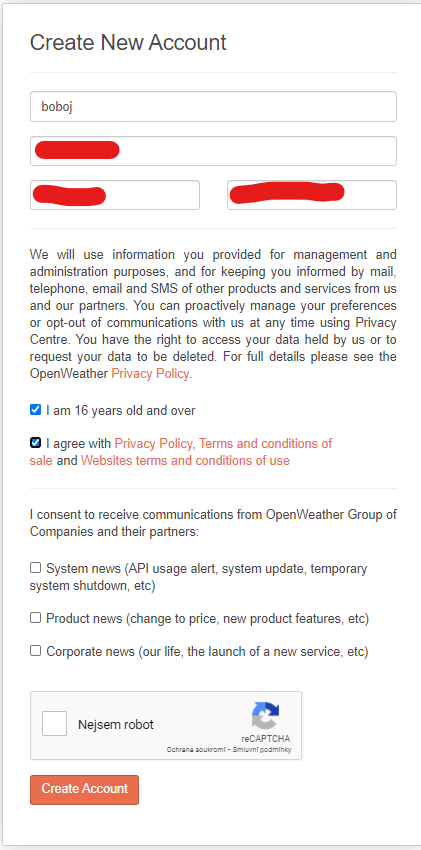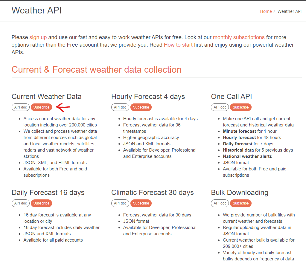 Nejdříve si založíme na stránce openweathermap.org/api API klíč. Dále klikneme na tlačítko Subscribe, které se nachází pod Current Weather Data pro získávání současných dat o počasí.