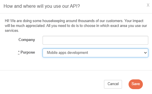 Poté obdržíte otázku směřující na účel vaší aplikace a na vaši firmu, toto není nutné vyplnit, ale můžete čistě vybrat účel aplikace, v tomto případě „Mobile apps developement“