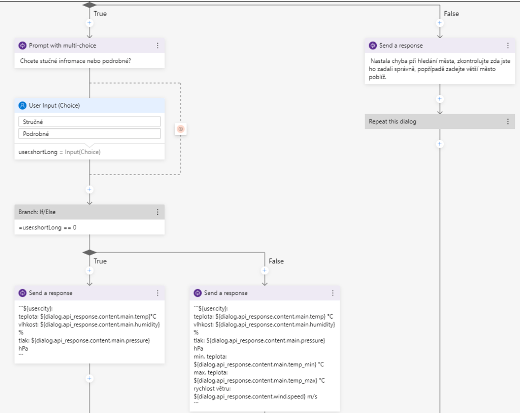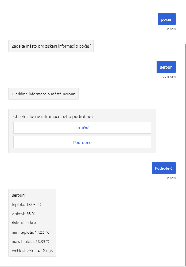 Jestliže se vám vše povedlo: Gratulujeme! Zvládli jste přivést na svět svého vlastního chatbota se schopností zjistit informace o počasí ve vybraných městech.