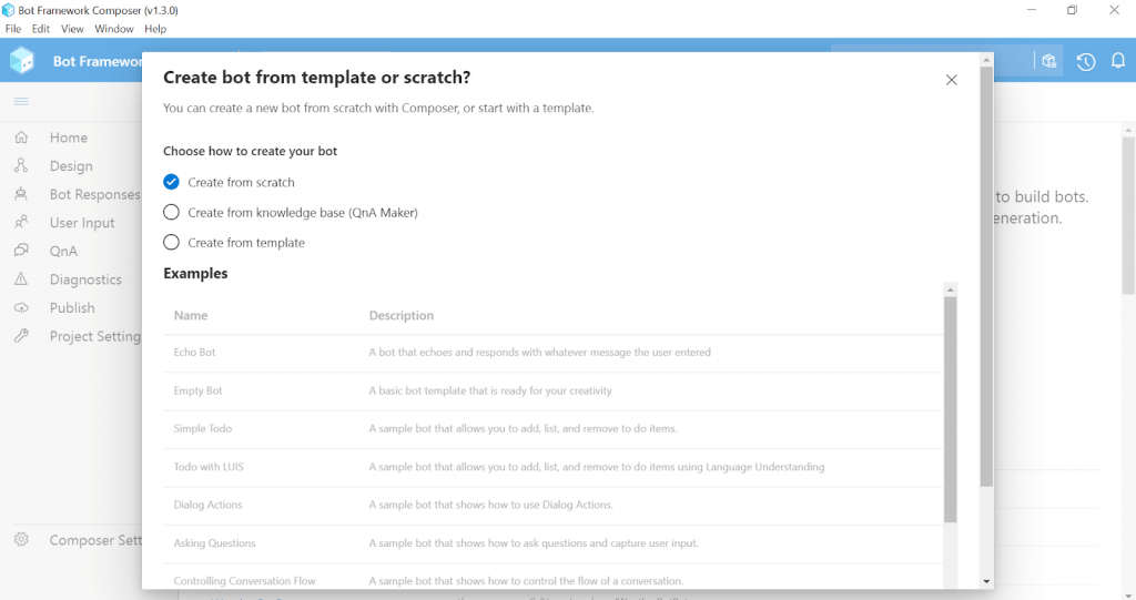 Aby mohl náš proces tvorby chatbota započít, musíme kliknout v Bot Framework Composeru na “New” a zvolíme "Create from scratch.” Poté bota pojmenujeme, zvolíme umístění na disku a klikneme na “Next.”