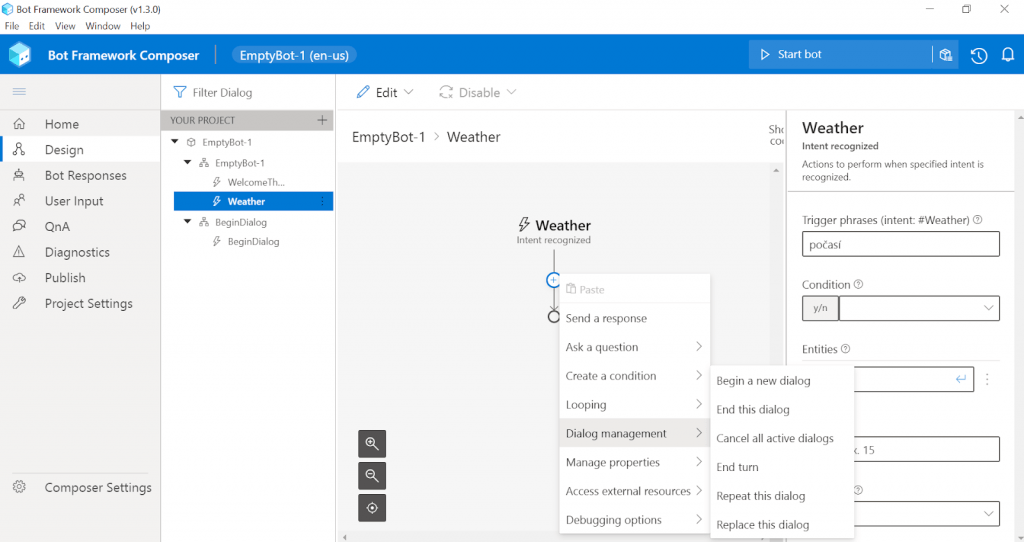 Bot Framework Composer lze vysvětlit jako integrované vývojové prostředí k práci s boty. V Composeru najdete vše, co potřebujete k vytvoření sofistikované konverzace: editor vizuálního dialogu, nástroje k trénování a správě Language Understanding (NLU), QnA Maker, generování jazyků a šablonové systémy pro jednoduché vytvoření vašeho automatického dialogu mezi vámi a uživatelem. V tomto článku si nastíníme základy Composeru v rámci projektu “Weather chatbot,” který vám pomůže se zorientovat v jeho základních funkcích.