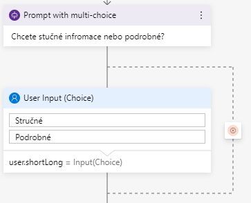 Do Bot Asks vložíme naší otázku "- Chcete stučné infromace nebo podrobné?".