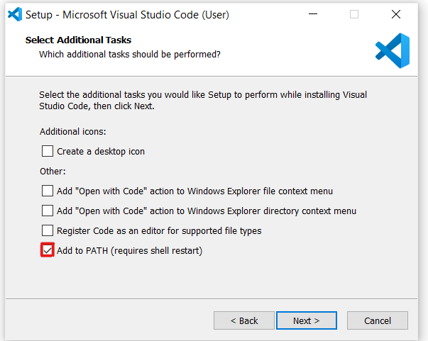 Nakonec už jen zatrhneme políčko pro přidání VS Code do naší systémové cesty (PATH), klikneme Install a máme hotovo.