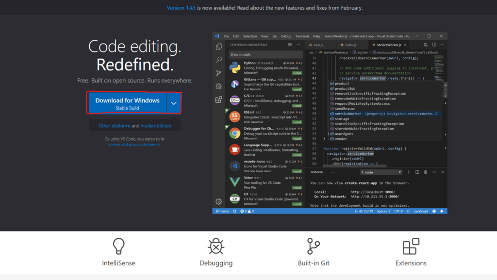 Na stránce code.visualstudio.com klikneme na tlačítko "Download for Windows"