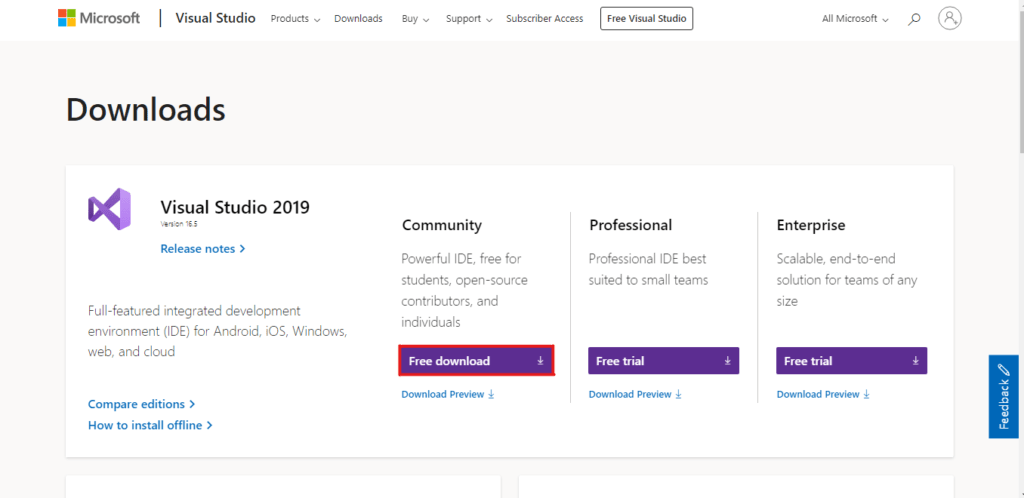 Naším prvním krokem bude přejít na stránku visualstudio.microsoft.com, kde začneme s naší instalací. Vybereme již zmíněnou verzi Visual Studio Community 2019 a začneme stahovat kliknutím na tlačítko "Free download", což znamená stažení zdarma.