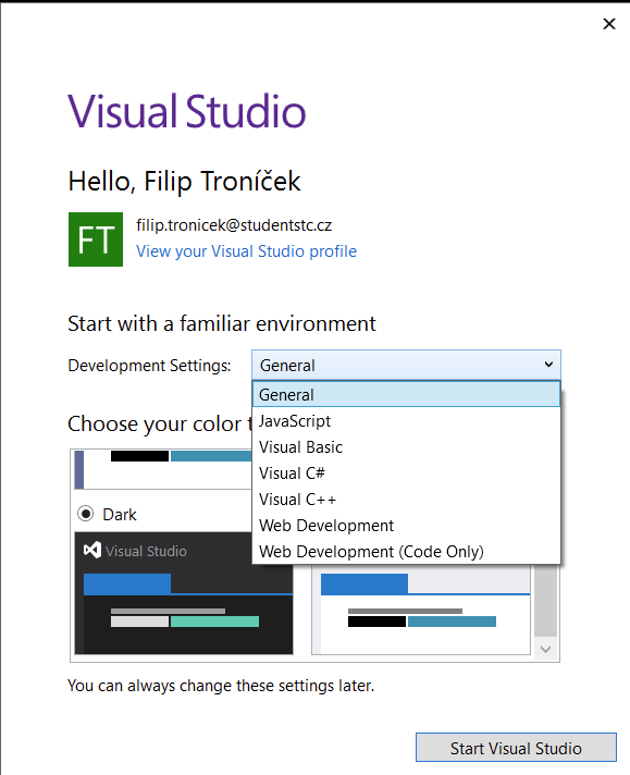 Po přihlášení si vybereme svoje rozložení editoru podle toho, v jakých jazycích/prostředích se pohybujeme, a také si vybereme náš barevný motiv.