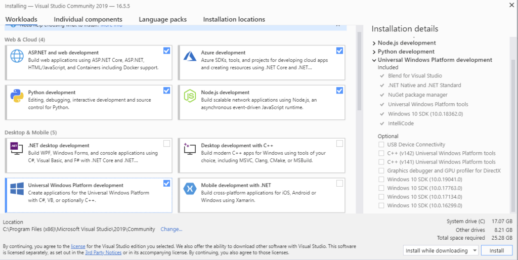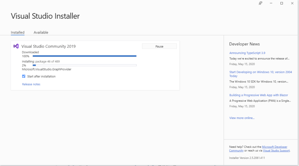 Visual Studio teď nainstaluje všechny námi zvolené komponenty, což bude chvíli trvat.
