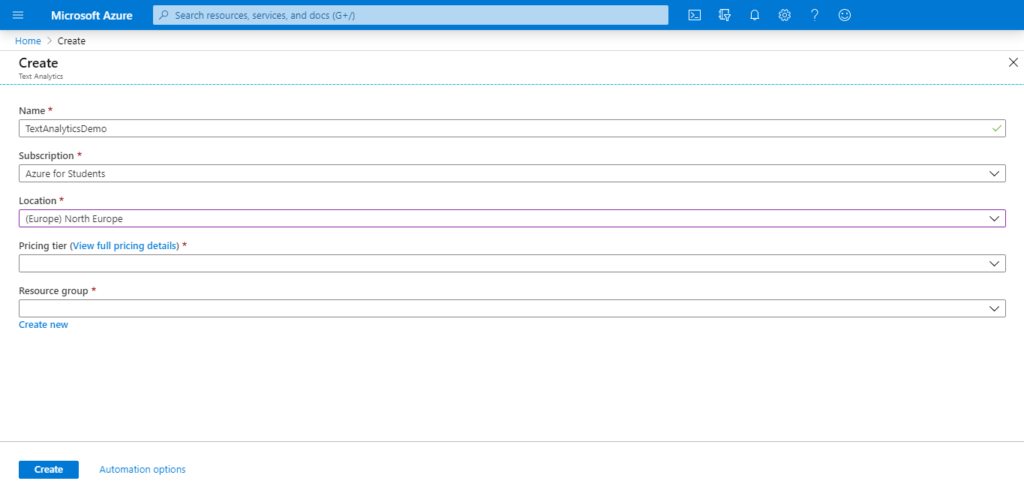 - Poté v sekci „Marketplace“ klikneme na „Text Analytics“ a vyplníme formulář, kde vybereme „Create new.“ Pro lokaci vybereme tu nejbližší k nám, což je "(Europe) North Europe", jako pricing tier vybereme F0 a resource group si vytvoříme novou.