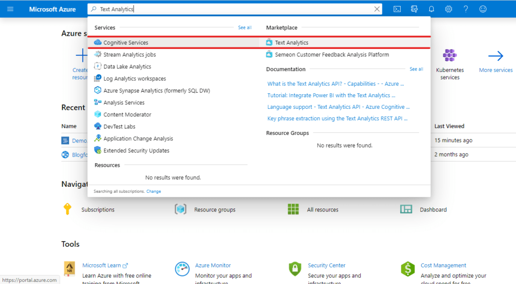 - Přesuneme se na Microsoft Azure Portal, kde vyhledáme pojem "Text Analytics."