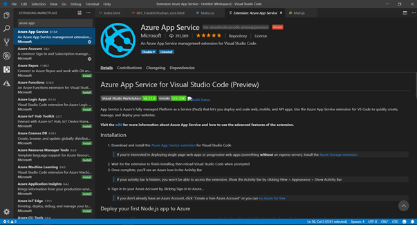 Nainstalujeme si do Visual Studia Code rozšíření – Azure App Service.