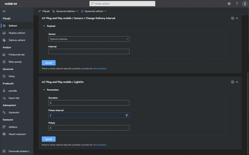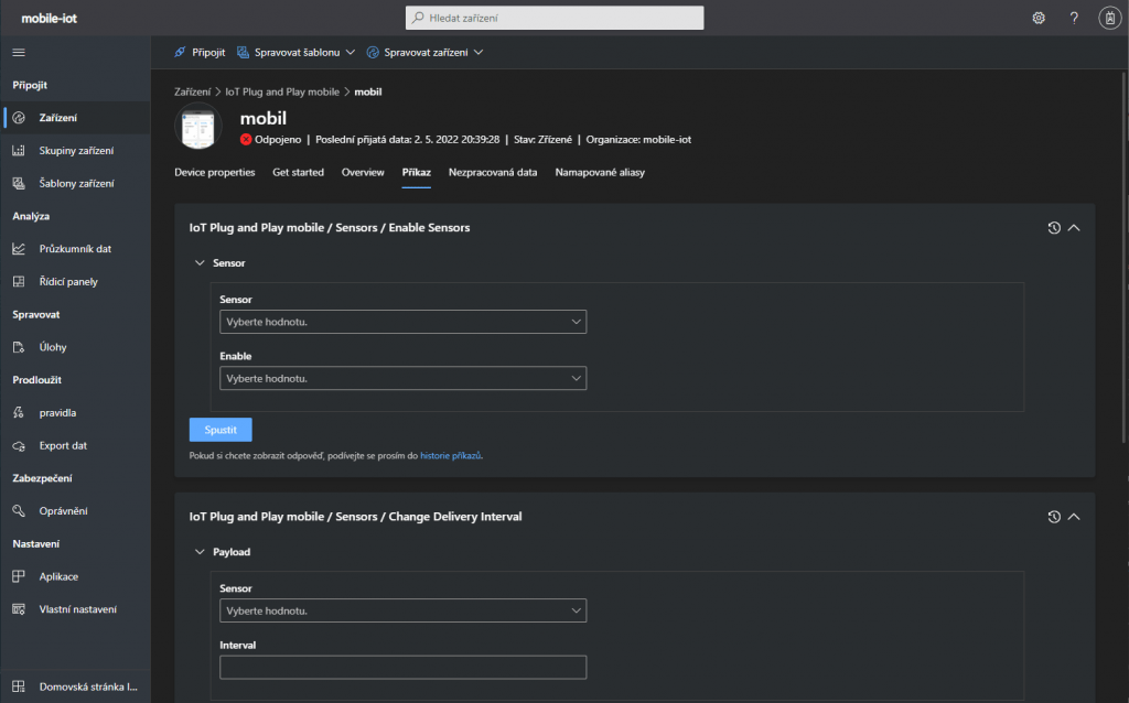 Aplikace na zařízení, která je připojena k IoT Central umí kromě posílání dat i přijímat příkazy z IoT Central. Aplikace IoT Plug and Play má pár ukázkových příkazů, které nalezneme v záložce Příkaz.