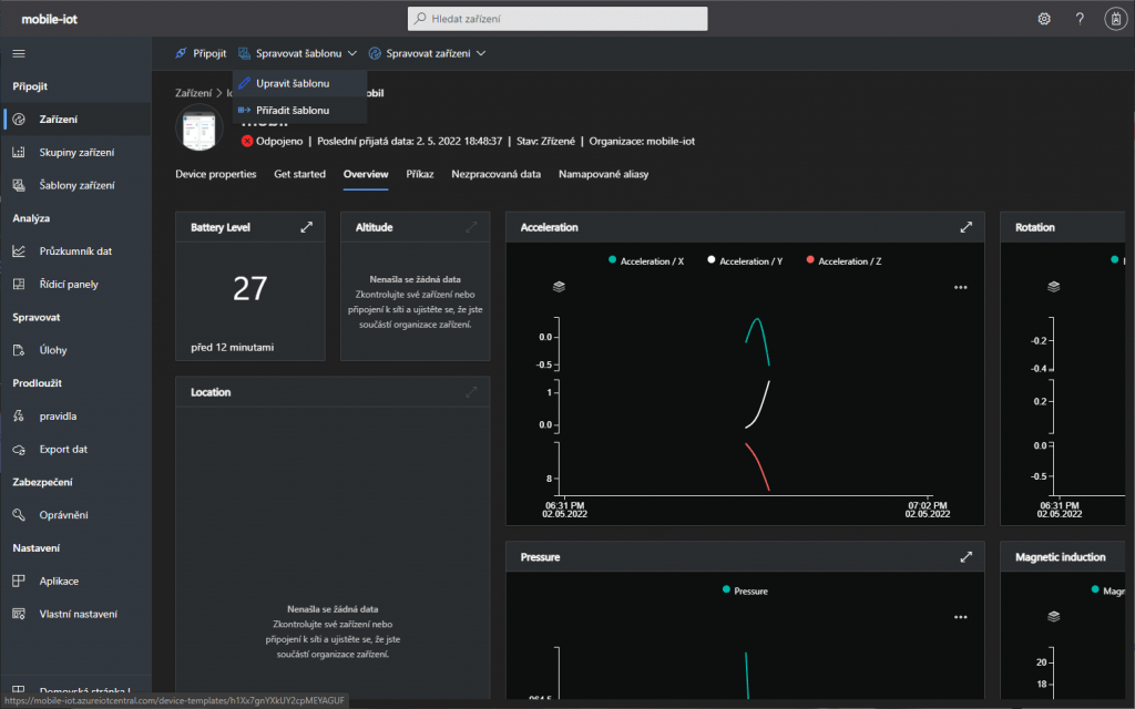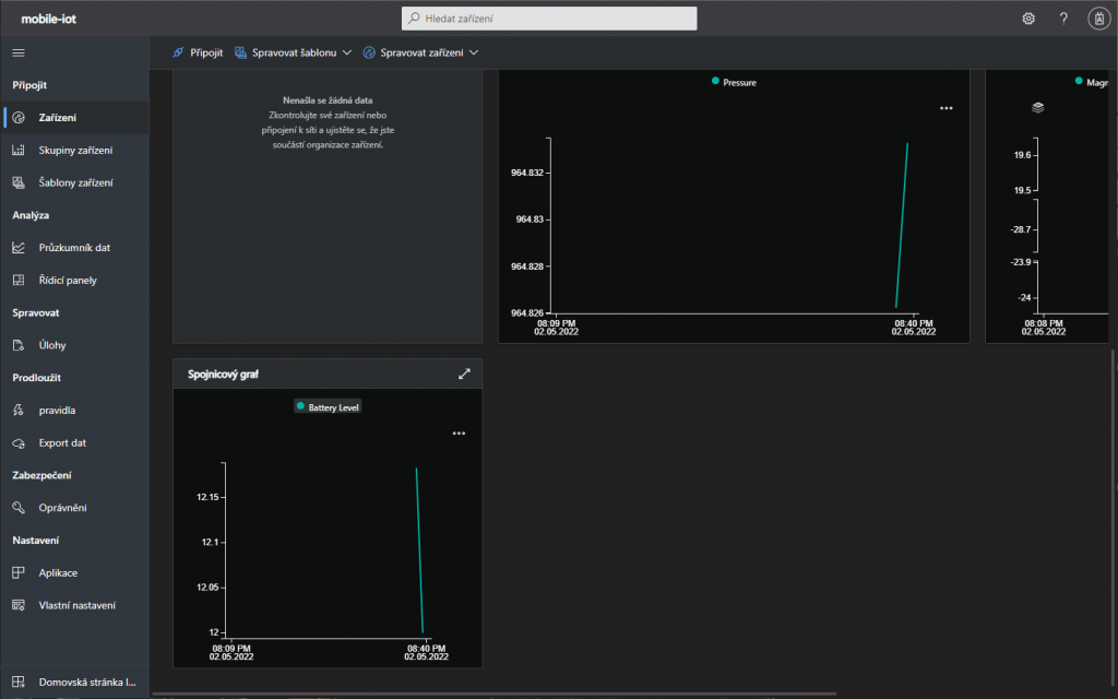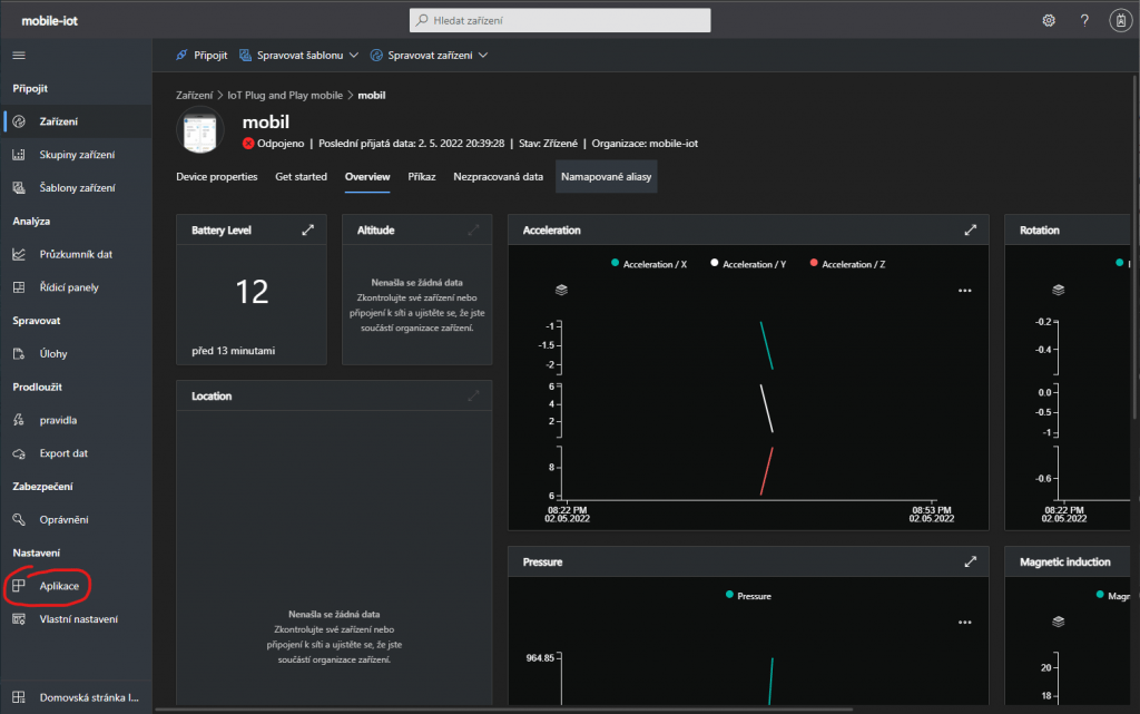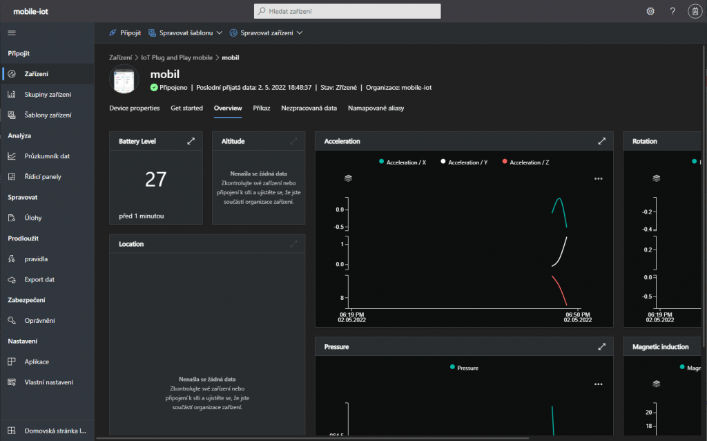 A to je vše. Naučili jsme se, jak si vytvořit z telefonu a mobilní aplikace IoT zařízení a vyzkoušet tím, funkce IoT Central. IoT Central je vhodný na sběr dat ze vzdálených zařízení nehledě na počet. Je plně vybavený funkcemi pro vizualizaci nasbíraných dat a správu zařízení. Pokud vás mobilní aplikace omrzí a chcete zkusit něco složitějšího, tak dalším krokem může být zkusit připojit k IoT Central např. Raspberry pi s vlastní aplikací.
