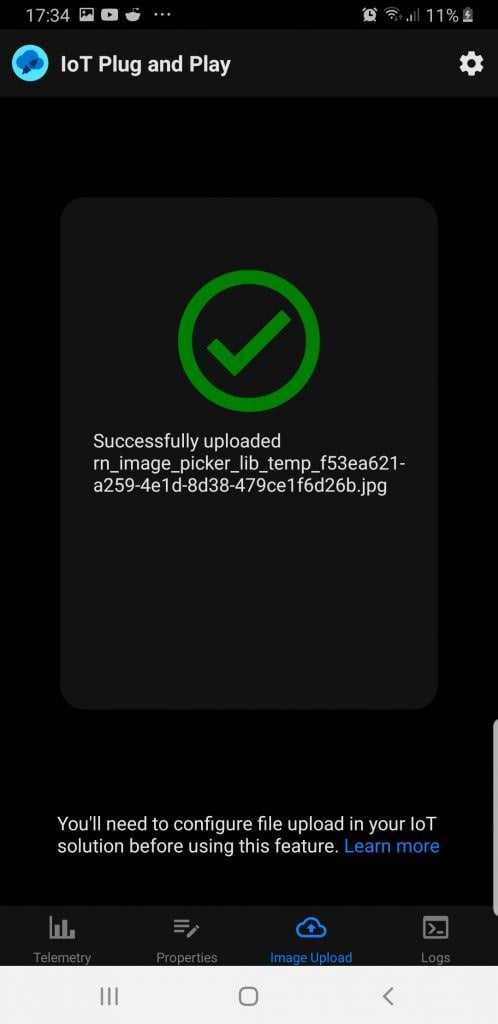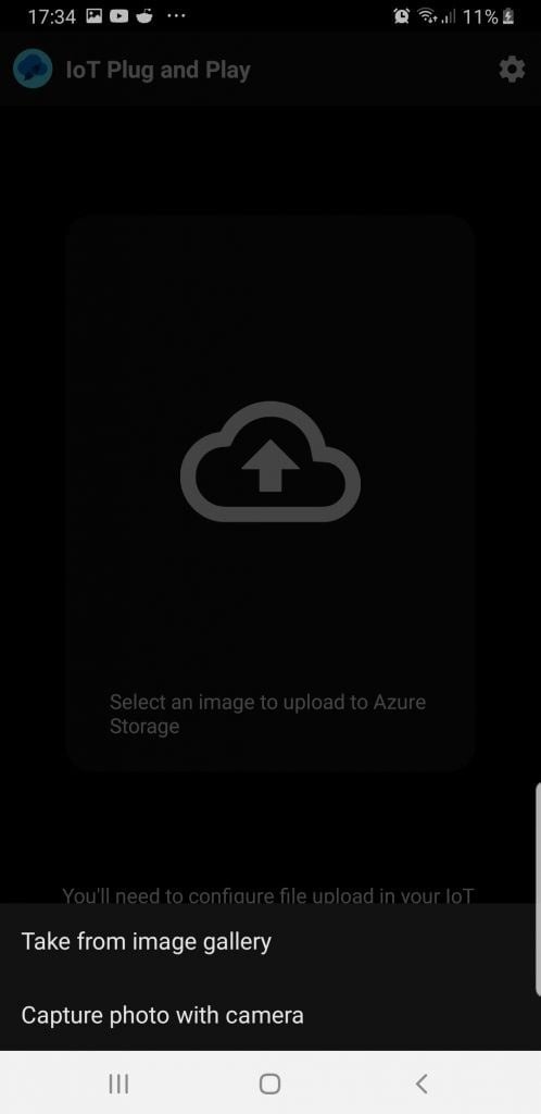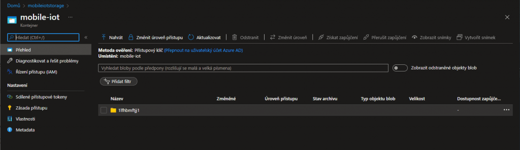 Aplikace IoT Plug and Play umí také soubory do Cloudu. Na nahrávání souborů je třeba mít účet uložiště a vytvořený kontejner. Pokud jste IoT Central nasadili pomocí tlačítka Deploy to Azure, tak už máte účet uložiště vytvořený a můžete přejít k mobilní aplikaci. Jinak musíte vytvořit účet úložiště a kontejner.