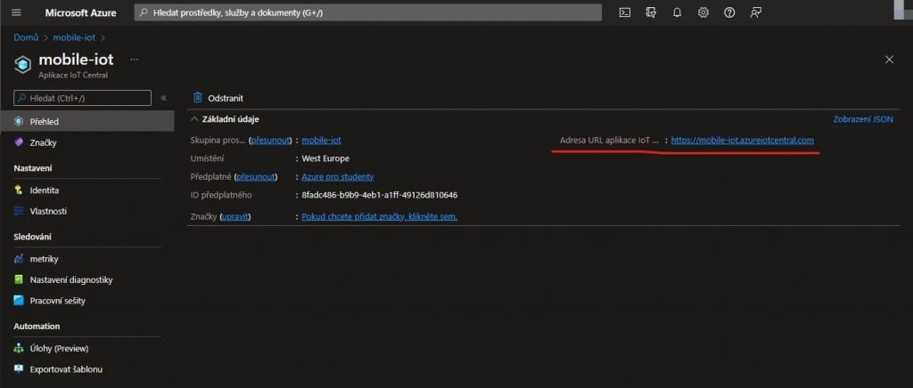 Klikneme na tlačítko přejít k prostředku a dostaneme se na stránku prostředku, tam klikneme na odkaz na webovou stránku aplikace IoT Central.