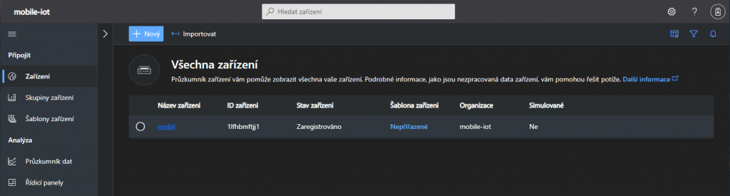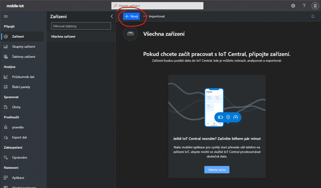 Teď jsme už na samotné stránce IoT Central. V portálu Azure teď už nebude nic potřeba dál dělat. Pro přidání zařízení klikneme na tlačítko Nový.