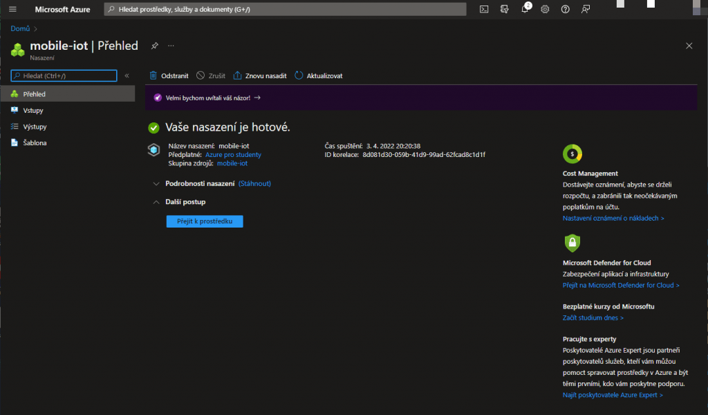 Pokud jsme všechno zadali správně, dostaneme se na tuto stránku, kde se prostředek nasazuje. Po pár minutách by se měl prostředek nasadit a objeví se tlačítko Přejít k prostředku.