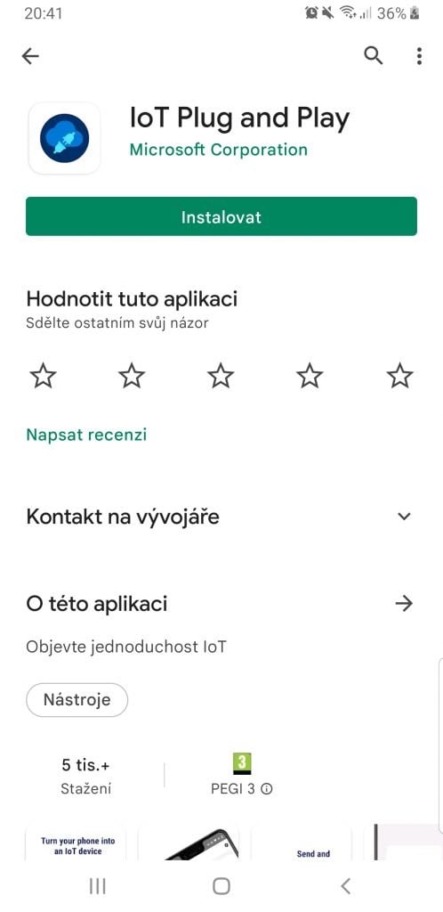 Část na počítači je hotová, teď se přesuneme na mobil. Z obchodu (v mém případě Obchod Play) si stáhneme IoT Plug and Play.