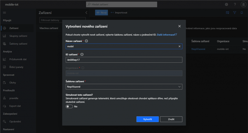 Zadáme vlastní název zařízení, ostatní nastavení není třeba měnit. Pak klikneme na tlačítko Vytvořit.