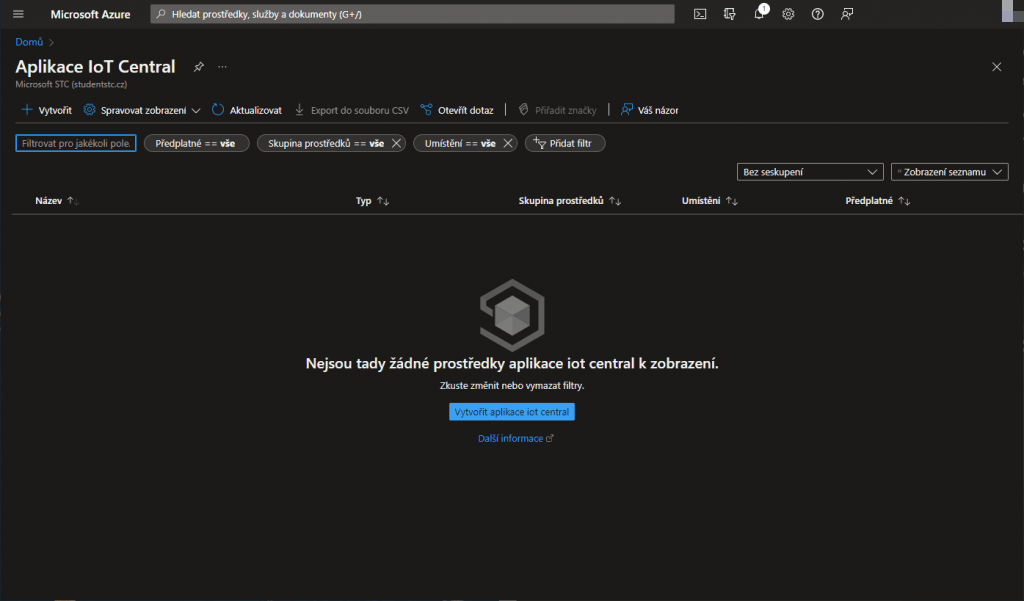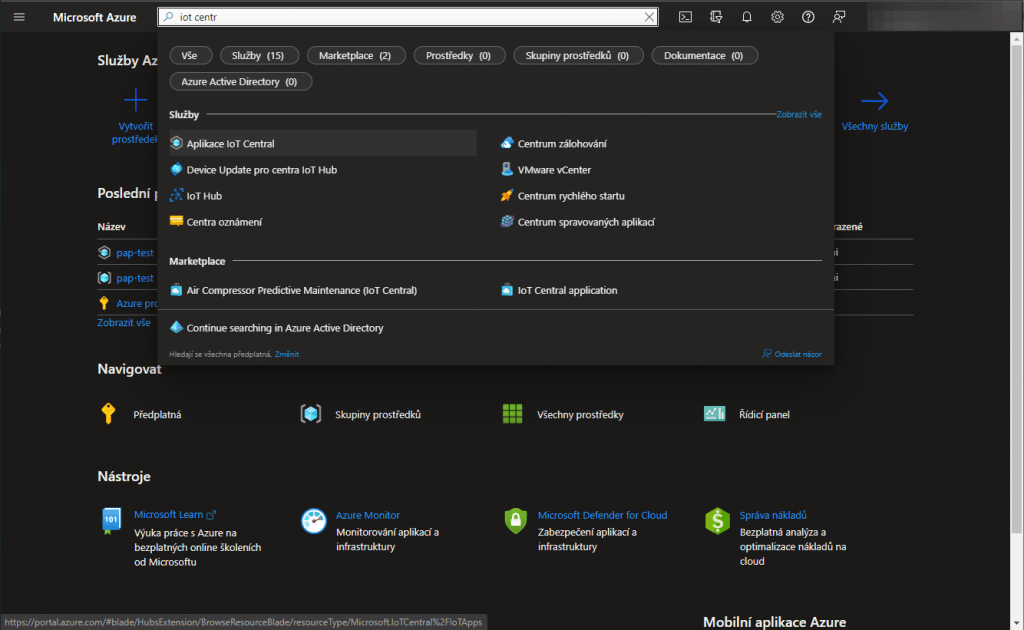 Na Azure Portálu vyhledáme službu Azure IoT Central.