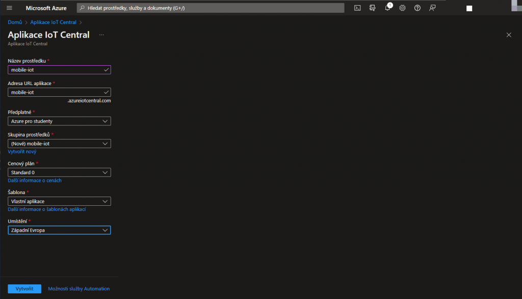 Název prostředku si vybereme podle sebe, adresu URL aplikace můžeme nechat stejnou. U skupiny prostředků klikneme na vytvořit nový a zadáme vlastní název. Cenový plán nastavíme na Standard 0. Šablonu nastavíme na Vlastní aplikace. Umístění vybereme co nejblíže k nám, pro mě Západní Evropa. Nakonec klikneme na vytvořit.