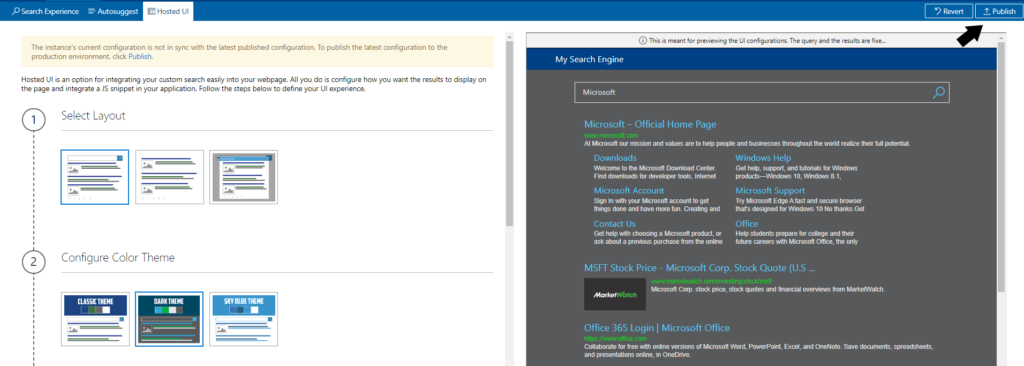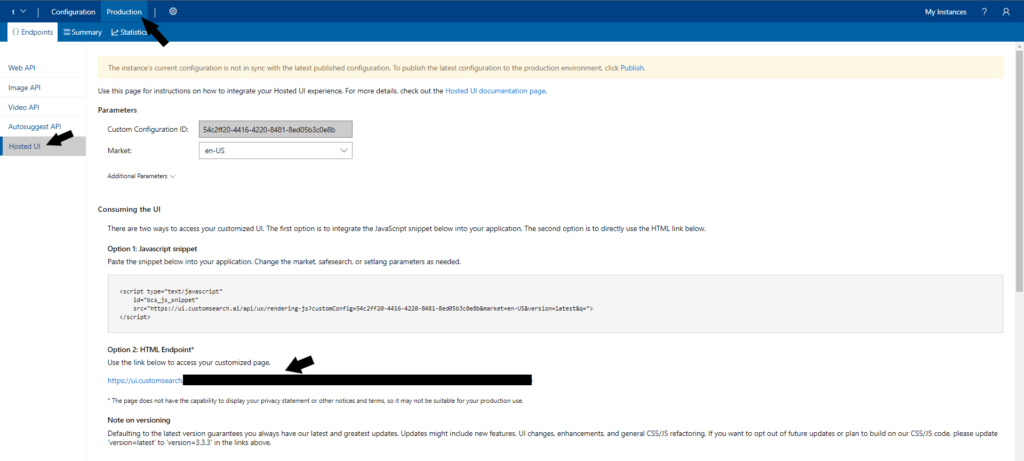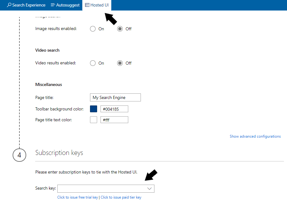 V Hosted UI [hostované uživatelské prostředí] si můžete nastavit vzhled vaší stránky, jednotlivé barvy, funkce, a kolik výsledků chceme na jednu stránku. Úplně naspod pod bodem 4 (spodní šipka) vložíte klíč, který jste získali z Azure portálu.