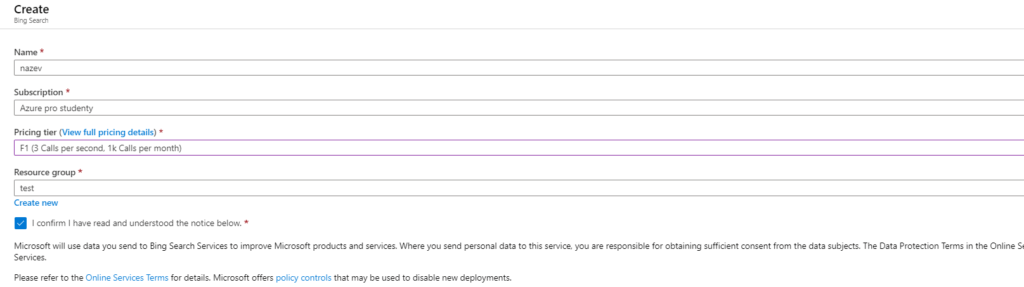 Zvolíme název, formu předplatného, v pricing tier [cenová úroveň] zvolíme možnost F0 (úroveň na zkoušení, za kterou nemusíte platit).
